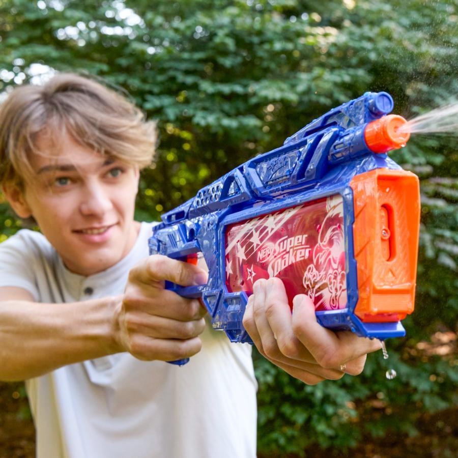 Red, white, and splash! Celebrate America’s 250th birthday with this special Dunk-Fill Freedom water blaster! Rock the red, white, and blue while pulling off instant refills—just dunk and go! The blaster’s colorful decorations are perfect for America’s big birthday bash. The easy instant-fill tank gets you ready for water-drenching fun in no time! There’s nothing for you to do, just submerge the translucent tank in water and watch as it instantly refills. The Dunk-Fill blaster has 12.1 fluid ounce (358 milliliter capacity). NERF Super Soaker blasters are great kids outdoor water toys for epic backyard battles, and they make awesome gifts to get everyone outside for fun, active play that’s a real splash!