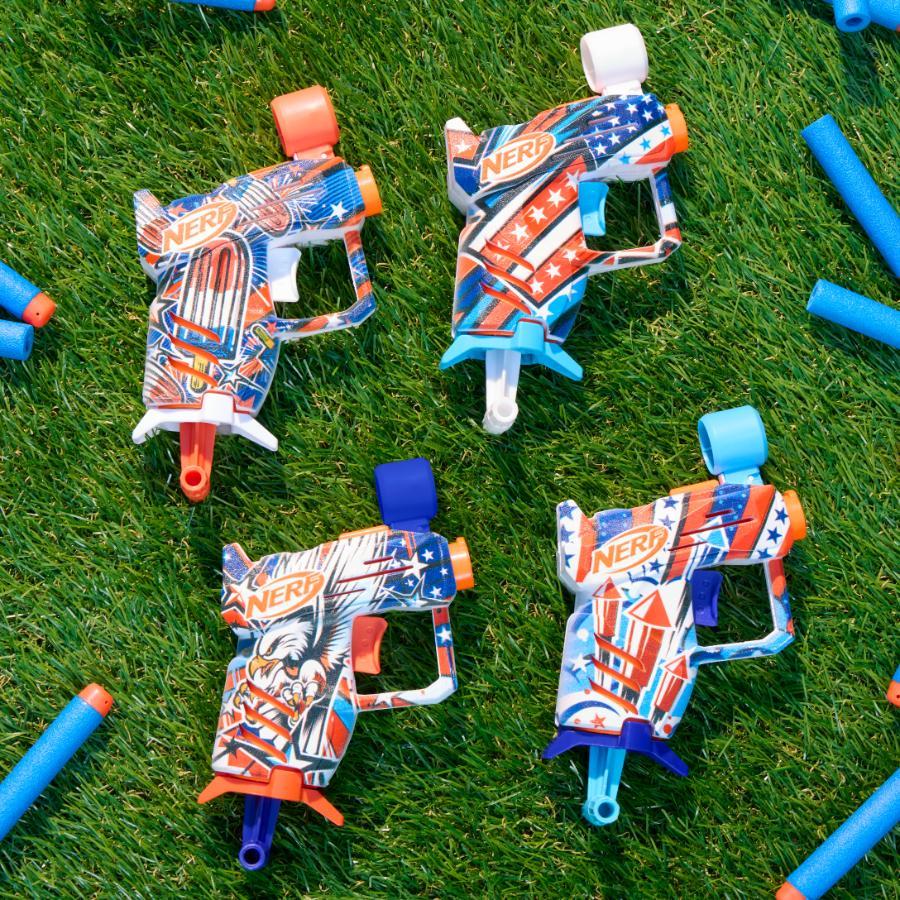 Red, white, and blast! Celebrate America’s 250th birthday with these special NERF Elite Freedom Frenzy dart blasters! Put your patriotic spirit front and center with this pack of 4 red, white, and blue blasters to mark the signing of the Declaration of Independence 250 years ago on July 4, 1776. These colorfully decorated blasters are perfect for America’s big birthday bash. Each single-fire blaster has a fixed scope that’s also storage for 1 dart. The set includes 16 Elite foam darts, giving you enough to load all 4 blasters with additional ones to keep nearby for quick reloads. Compact in size, they’re easy to use: Front-load a dart, pull down the priming handle, and pull the trigger. The NERF Elite Freedom Frenzy 4-Pack is perfect for July 4th gatherings with family and friends to blast into fun outdoor NERF battles in the backyard. Eyewear recommended (not included). No batteries required.