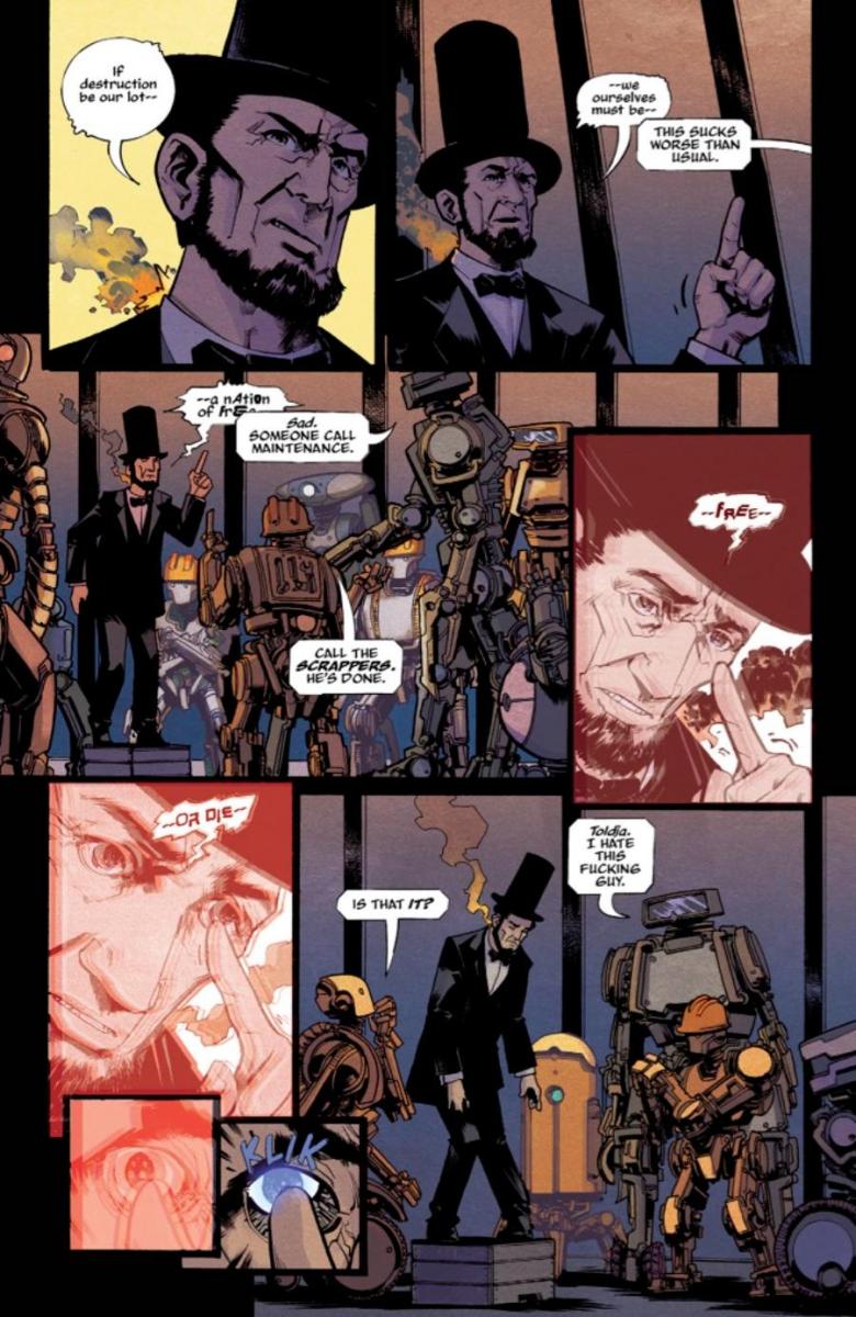 In If Destruction Be Our Lot, humanity is extinct and all that remains are the robots who once helped us.The robots are happier now, doing their work without human interference. But not Abe, a robotic replicant of Abraham Lincoln in search of meaning beyond the daily grind. Abe believes there must be something more out there beyond the edge of the city. After nearly getting killed, he’s determined to wander the Earth until he finds it… or gets recycled trying.