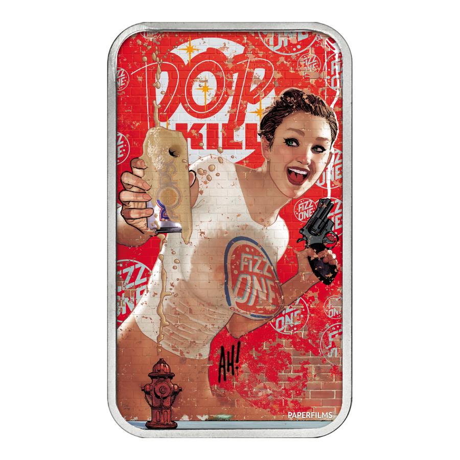 I first met the Bullion Baddies team over a year ago at Heroes Con, where they showed me their insane 4‑color printing process on silver bars. I was blown away by the beautiful craftsmanship, the vibrancy, the finish… it was next‑level. They were fans of the work we do here at Paperfilms, and we started talking, and before long we were dreaming up a collaboration featuring art from our POP‑KILL series.