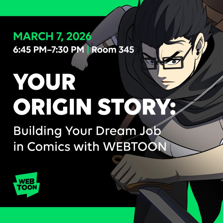Your Origin Story: Building Your Dream Job in Comics with WEBTOON (Saturday, March 7 at 6:45 PM PT in Room 345)Featuring Jjolee, Cuffing Cupid and Lost in Translationcreator; Tikklil, Night Owl & Summer Skies artist; Erik Kozura, WEBTOON Managing Producer; and Valeri Alemania, WEBTOON Editor.