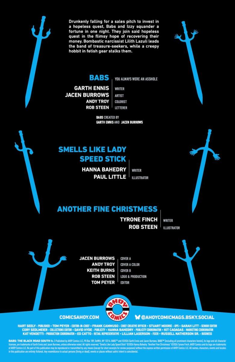 On Wednesday April 1, AHOY Comics will publish BABS: THE BLACK ROAD SOUTH #3, the third issue of the violently funny sword-and-sorcery epic from Garth Ennis—the award-winning writer of Hitman, The Punisher, Sara and Marjorie Finnegan, Temporal Criminal, and co-creator of The Boys and Preacher—and acclaimed artist and frequent collaborator Jacen Burrows (Crossed, The Ribbon Queen). After making waves last year with BABS—the fantasy adventure romp featuring the sharp-tongued and sharper-sworded barbarian Babs—Ennis, Burrows, and Syracuse-based publisher AHOY Comics are back for more carnage and comedy in BABS: THE BLACK ROAD SOUTH. The six-issue action comedy mini-series will find Babs and her partner-in-barbarism Izzy in a brand-new adventure after a win in a gladiator arena lands them an unexpected windfall—with even more unexpected consequences.