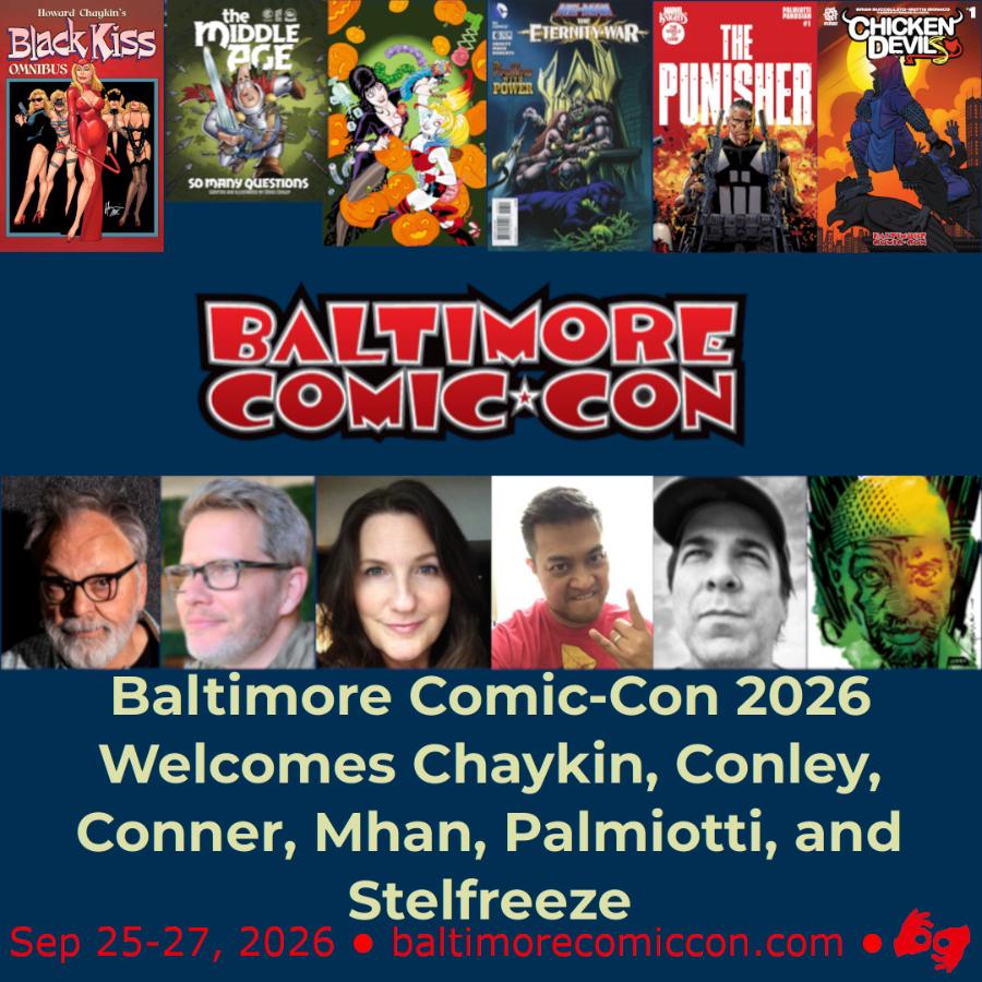 Join the 2026 Baltimore Comic-Con at the Inner Harbor’s Baltimore Convention Center on September 25-27, 2026. The Baltimore Comic-Con is very happy to announce Howard Chaykin, Steve Conley, Amanda Conner, Pop Mhan, Jimmy Palmiotti, and Brian Stelfreeze as guests of our 2026 event! Your tickets are waiting for you online now!