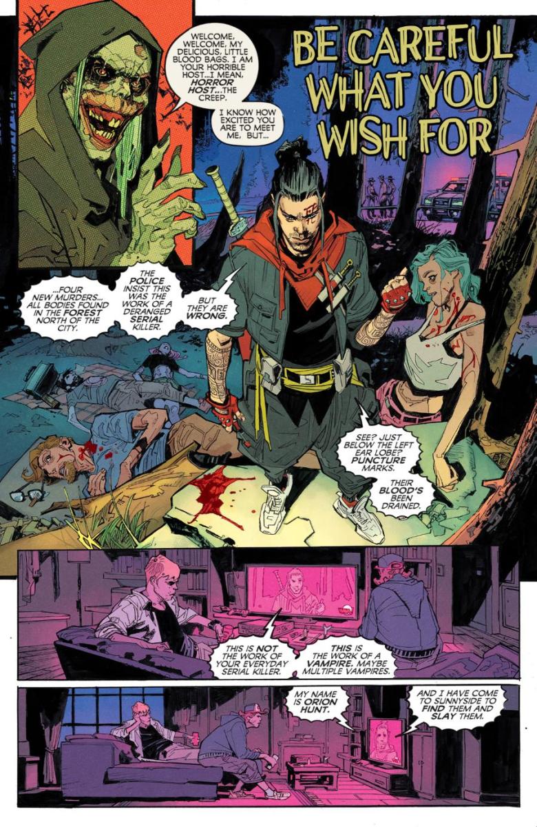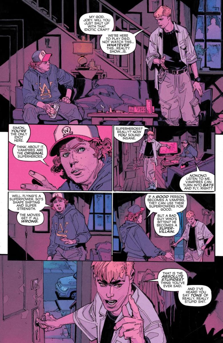 Where do superhero powers come from? Surely, not there… Gerry Duggan (X-Men, Deadpool) and Scott Buoncristiano (The Dark Room) reveal the dark truth about the mastermind behind a superhero and the lengths he’ll go to steal the spotlight. Then, the iconic Marv Wolfman (New Teen Titans, Crisis on Infinite Earths) and Michele Rubini (Zagor) ask the most important question of all: Are vampires superheroes?