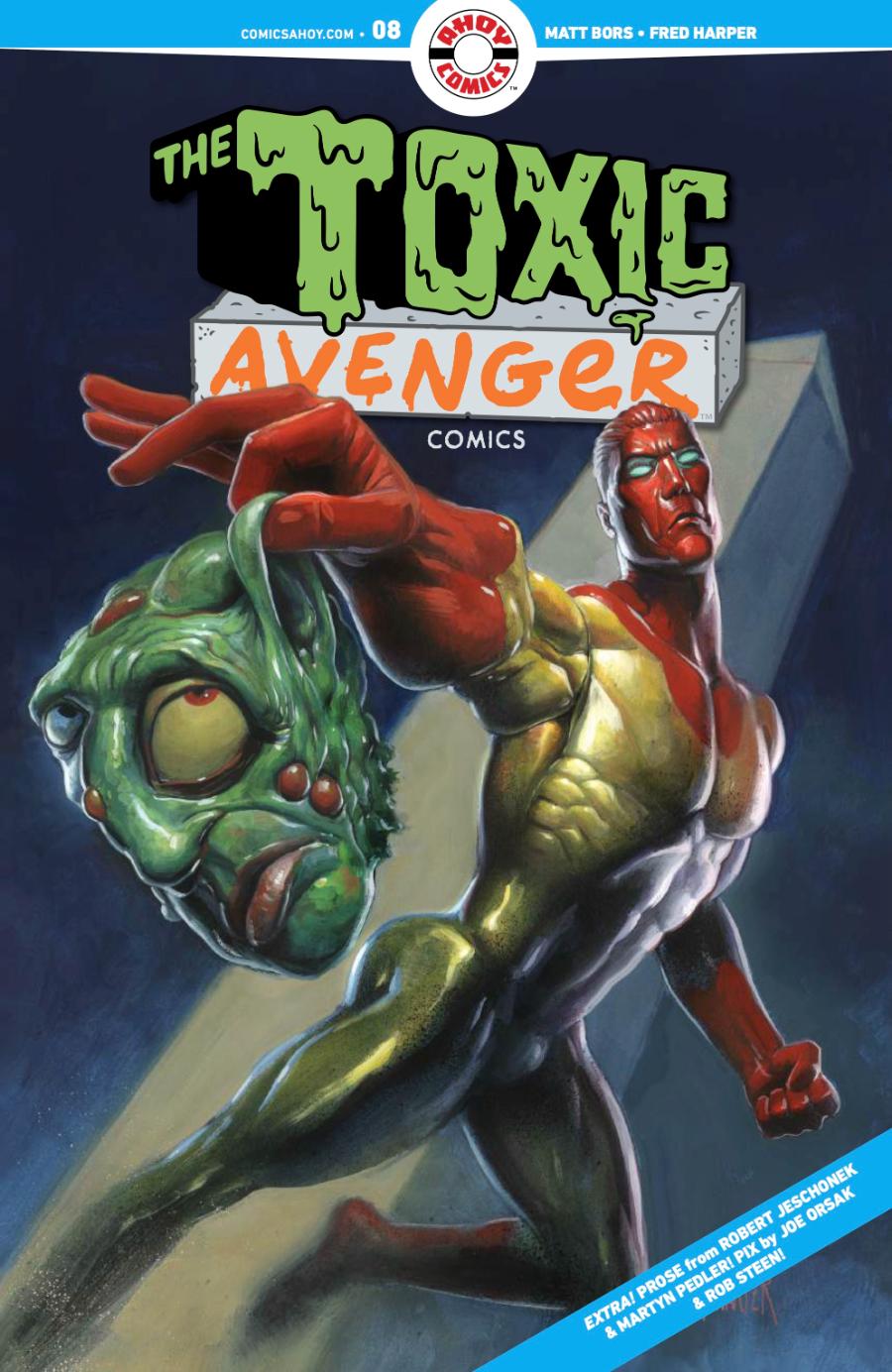 Next Wednesday April 1, acclaimed Syracuse-based comic book publisher AHOY Comics will publish THE TOXIC AVENGER COMICS #8, the latest issue in an all-new ongoing series masterminded by THE NIB founder and two-time Pulitzer Prize finalist Matt Bors, who will be writing the series with art by Fred Harper. The brand-new multi-issue arc — which kicked off with THE TOXIC AVENGER COMICS #6, aka “Toxie Goes to Washington” — finds Toxie in hot water in our nation’s capitol. THE TOXIC AVENGER COMICS #8 introduces readers to Doctor Planet, an environmentally conscious hero for our age—upstanding on the outside, embittered on the inside—and the Planet Teens.