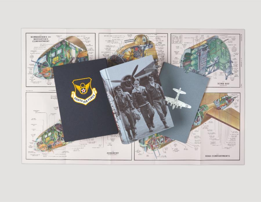 and will feature: a photographic title page spread; 32 pages of black and white photographs; two black and white integrated maps; one diagram; a blocked slipcase; original illustrations from a 1940s B-17 manual stored in a separate pouch, which slips into the slipcase; and an exclusive reproduction of a famous piece of aviation art by master artist Gil Cohen.