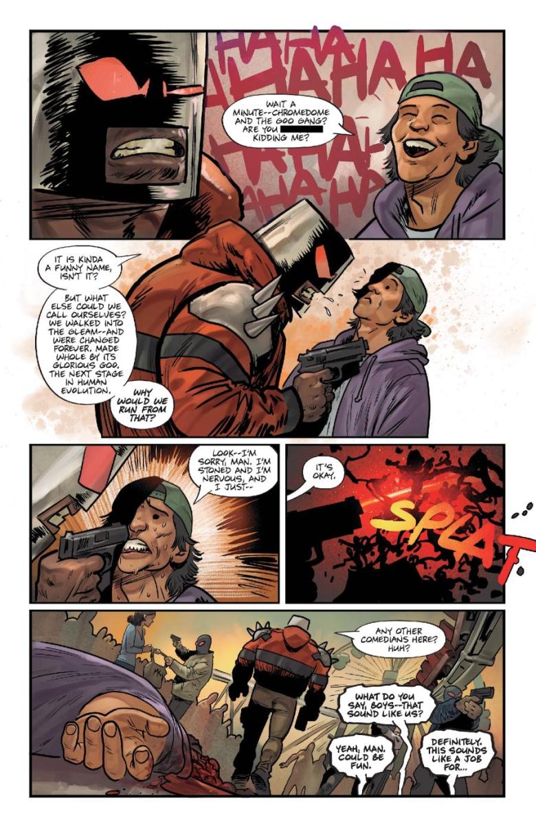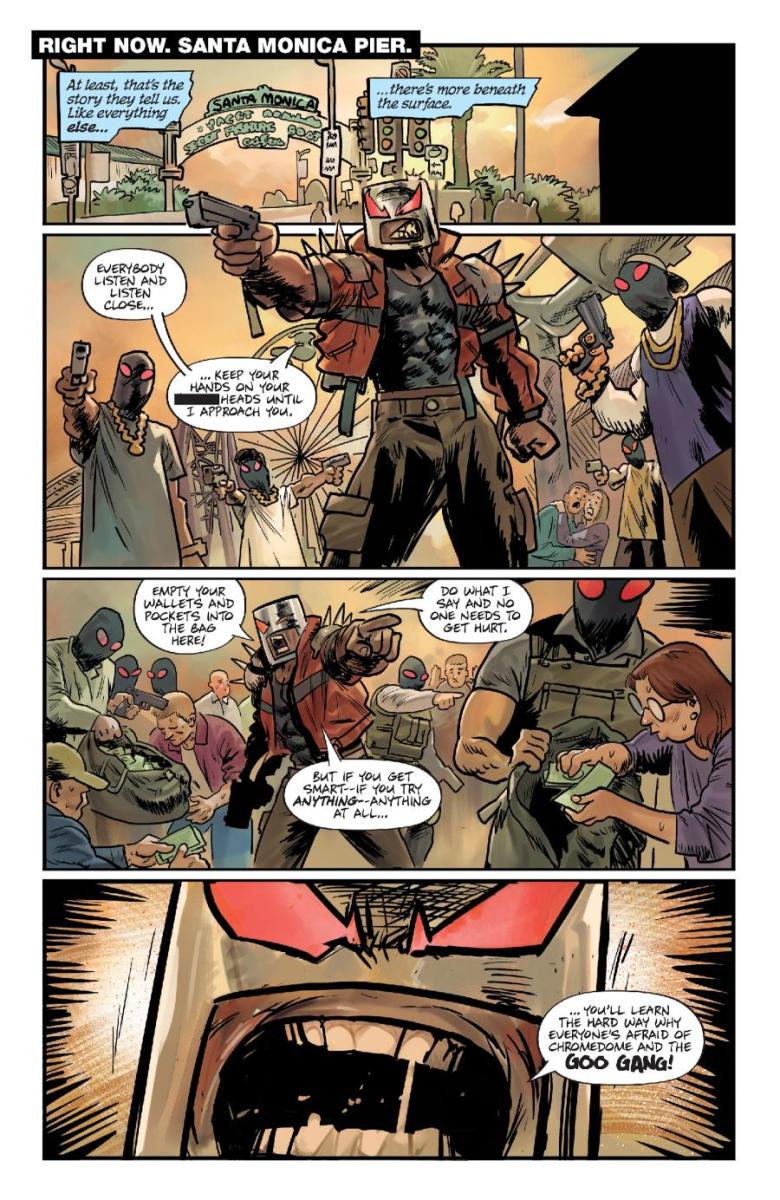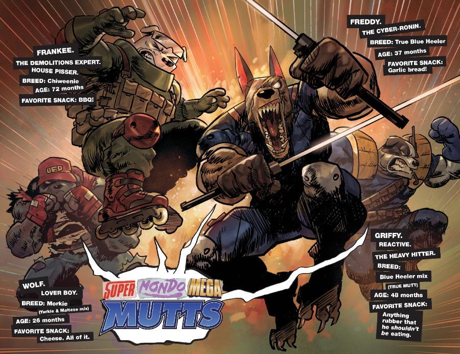 One year ago, a fragment of an interdimensional civilization collided with Downtown L.A. – creating an impregnable no-man’s-land where the laws of physics no longer apply. Convinced that no human being could survive the terrain within, the US government’s most morally compromised contractors decided to explore the area codenamed “The Gleam” by sending in four research animals in the hopes of capturing its precious technological wonders. They were hoping to find a new kind of weapon. What they got instead was four radically transformed dogs with minds and a mission all their own. WOLF! FRANKEE! GRIFFY! FREDDY! Together with their brilliant mentor MOJO, the SUPER MONDO MEGA MUTTS are going to bring justice back to the avenues and alleyways where out-of-control federal forces and gangs powered-up by pilfered alien technology now reign. They thought they could put this band of outlaw misfits on a leash… Now the world is going to discover what happens when these mutts BITE BACK.