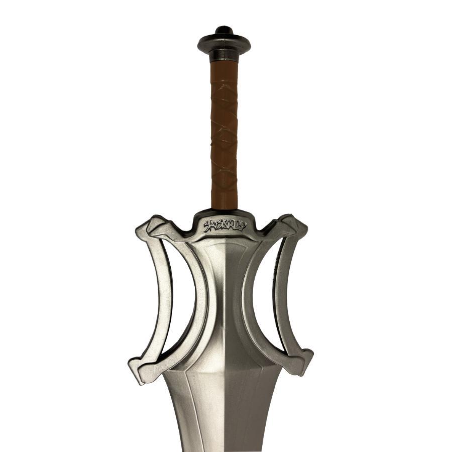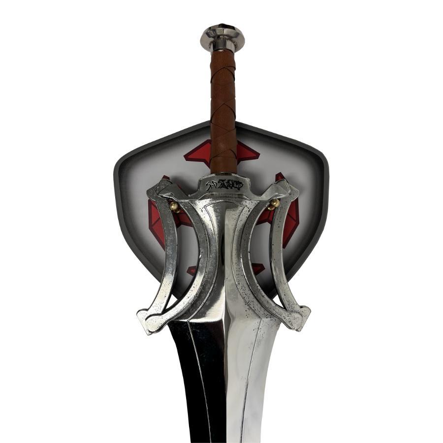 Cast in solid metal for authentic weight and presence, the sword features a high-pressure die-cast aluminum alloy construction, chrome-plated finish, hand-applied weathering, and a leather-wrapped grip. Each sword is an imposing 43.25 inches long, weighs approximately 8 pounds, and is paired with a themed display plaque and a certificate of authenticity.