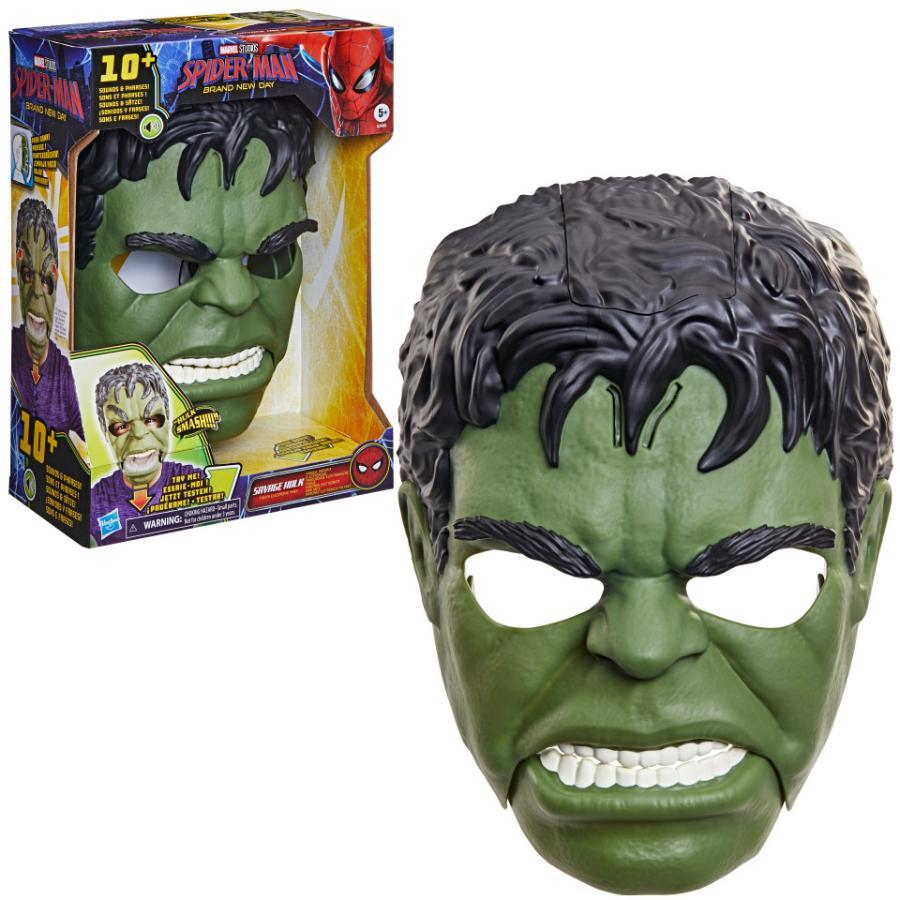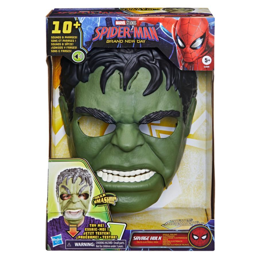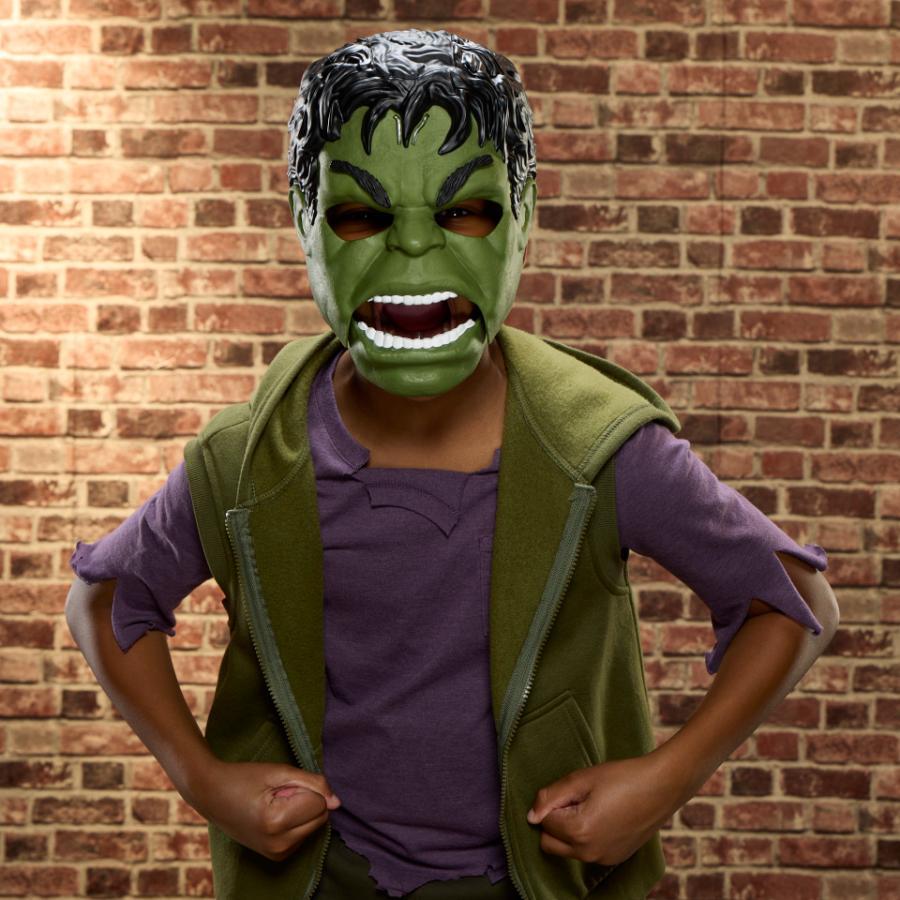 HULK SMASH! Unleash gamma-powered playtime with the Savage Hulk Talk’n Electronic Mask from Hasbro! This electronic role play toy for kids features over 10 sound effects and phrases, including moving eyebrows and an opening mouth. Even cooler, it’s kid-activated! While wearing the mask, kids can open their mouths, which will open Hulk’s, and activate awesome effects. Featuring design inspired by Marvel Studios’ Spider-Man: Brand New Day, part of the Marvel Cinematic Universe, kids will love re-creating favorite scenes and imagining their own powerful adventures. Look for more Marvel toys for boys and girls ages 5 and up to build a collection or give as gifts for kids on birthdays, holidays, and other special occasions (each sold separately, subject to availability).