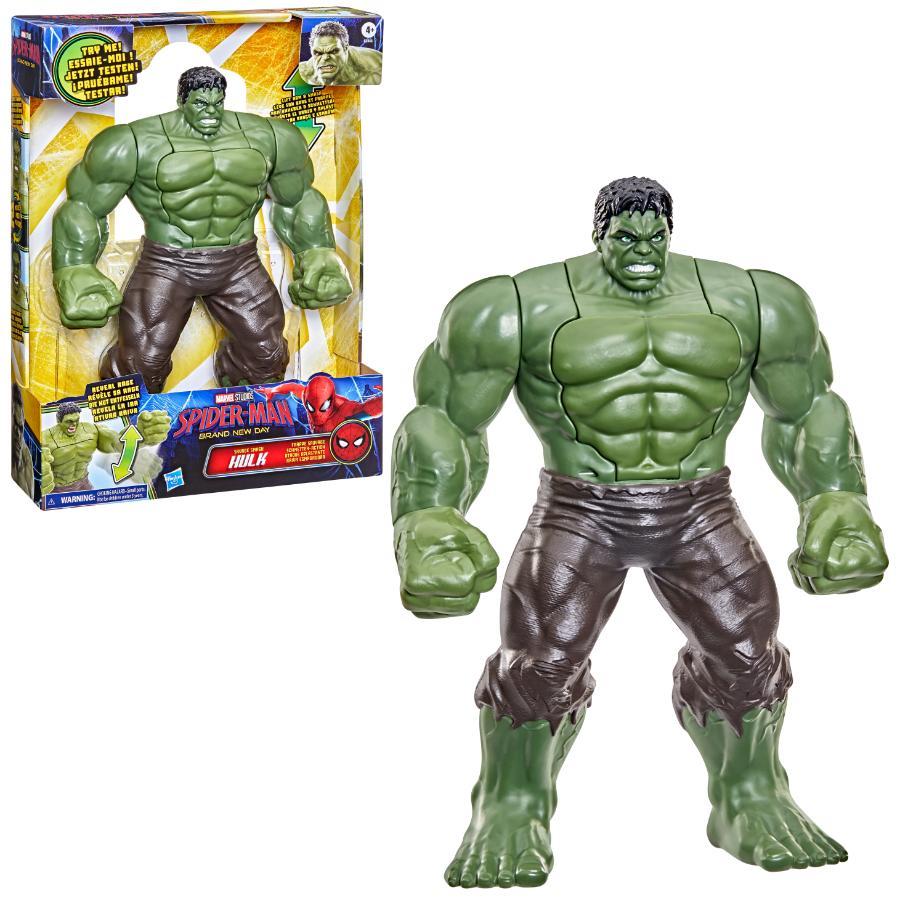 HULK SMASH! Imagine fierce action and adventure with the Marvel Savage Smash Hulk figure from Hasbro! Playtime gets a gamma-powered boost with this collectible 2-in-1 action figure. Lift the arms and lower them in a smashing motion to cycle through 2 angry modes of play, including Classic Angry Mode and Savage Angry Mode. Featuring design inspired by Marvel Studios’ Spider-Man: Brand New Day, part of the Marvel Cinematic Universe, kids ages 4 and up will love re-creating favorite scenes and imagining their own powerful adventures. Spider-Man toys from Hasbro make great gifts for birthdays, holidays, and other special occasions. Look for more Marvel toys for boys & girls to collect, including cool action figures, playsets, vehicle toys, and role play gear (each sold separately, subject to availability).