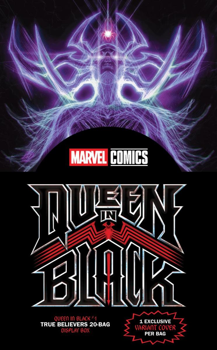 In addition to TRUE BELIEVERS BLIND BAGS, QUEEN IN BLACK #1 will also be available in TRUE BELIEVERS DISPLAY BOXES, special boxes that contain 20 copies of the issue, including 19 TRUE BELIEVERS BLIND BAGS and one display box-exclusive variant cover by Patrick Gleason